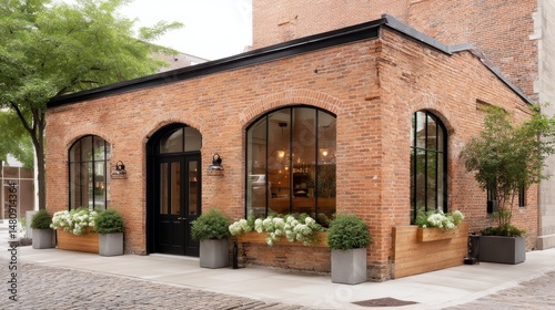 Elegant Restaurant Exterior with Patio Seating and Modern Design Elements, Urban Setting.