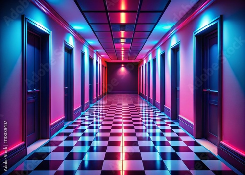 Elegant Retro Hallway with Neon Lighting and Checkered Floor Tiles in a Minimalist Style, Perfect for Modern Interior Design and Architectural Photography