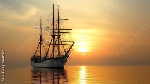 Elegant Sailing Vessel in Golden Sunset Reflection on Tranquil Waters : Generative AI