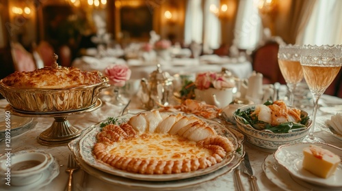 Elegant seafood dinner, palace setting, champagne, fine dining
