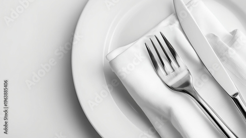 Elegant silver cutlery arranged on a white napkin and plate, highlighting a luxury dining setup with minimal style, clean composition, and refined table setting.