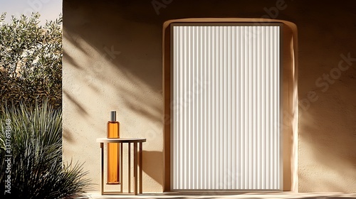Elegant Still Life Composition of Fragrance Bottle on Minimalist Table Near Textured Wall and Plants