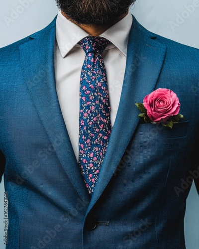 Elegant Suit with Blue Tie and Pink Rose Buttonhole for Formal Occasion