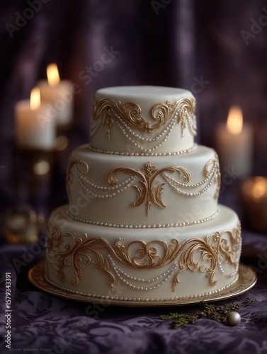 Elegant three-tier wedding cake with gold filigree and pearls on purple background