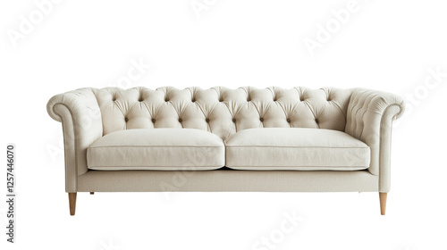 Elegant tufted sofa in cream fabric with plush cushions and wooden legs, perfect for modern living spaces