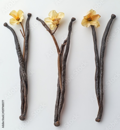 Elegant vanilla pods with dried flowers arranged on a clean white background showcasing natural textures and colors for culinary inspiration and design use