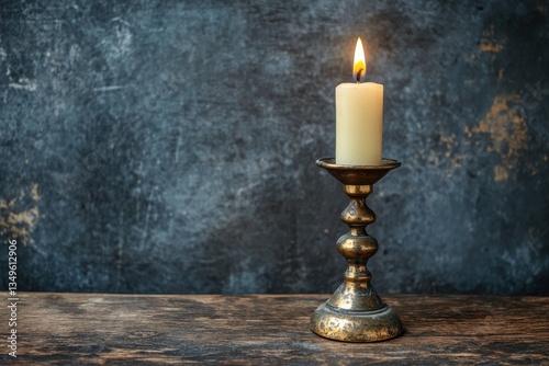 Elegant vintage candle holder with a lit candle set against a textured dark backdrop in a cozy room