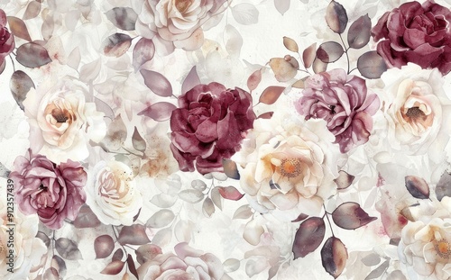 Elegant watercolor floral pattern with soft roses in shades of pink, red, and cream on a light, abstract background