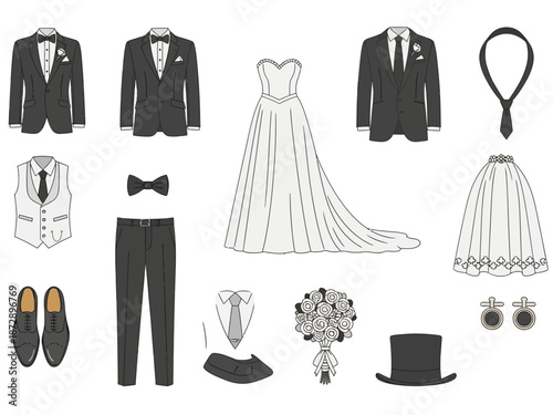 Elegant Wedding Attire Collection Groom and Bride Fashion Illustration