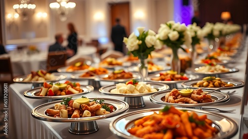 Elegant wedding buffet table with gourmet dishes on silver platters under soft lighting.