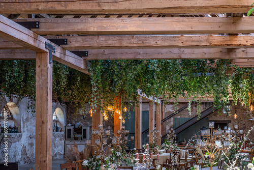 Elegant wedding celebration featuring beautifully decorated tables with crystal glasses, lush greenery, and warm lighting creating a stylish atmosphere for a memorable party experience
