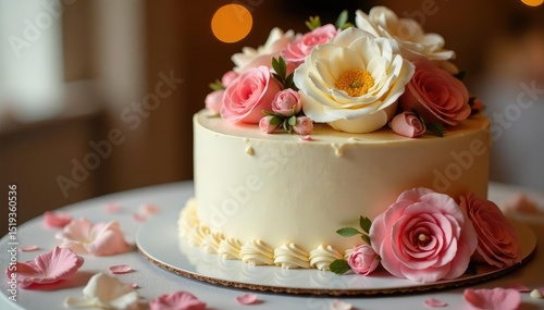 Elegant wedding reception cake, beautifully decorated with frosting and flowers Perfect for celebration and event websites , wedding ideas, wedding planning, cake stand