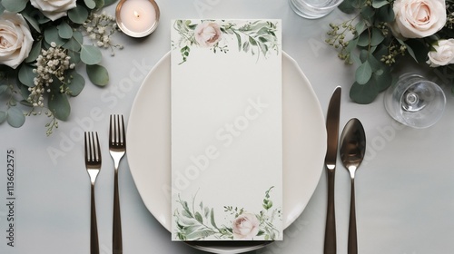 Elegant wedding table setting with floral menu card.
