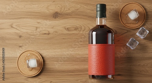 Elegant Whiskey Bottle with Leather Wrap and Ice on Wooden Surface