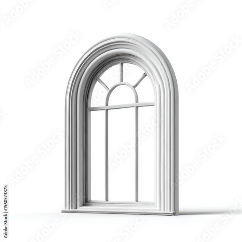 Elegant white arched window with decorative molding and divided panes isolated on white background