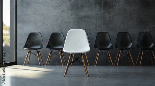 Elegant white chair among black chairs, industrial grey studio, 3D render, business uniqueness
