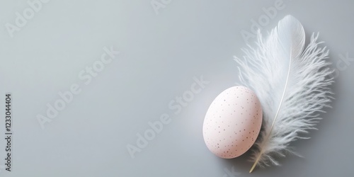 Elegant white feather and speckled egg on subtle gray background for easter theme