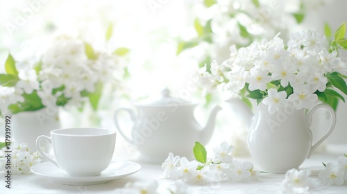 Elegant White Flowers with Tea Set on Bright Table Setting