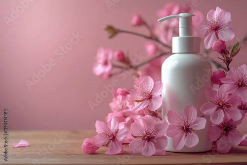 Elegant White Lotion Bottle Surrounded by Delicate Pink Cherry Blossoms on Wooden Surface Against Soft Pink Background
