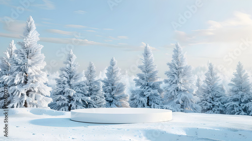 Elegant White Podium in Winter Wonderland - Snowy Landscape with Pine Trees