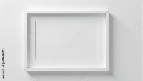 Elegant white square frame mounted on pristine wall. Centered perfectly, it casts delicate shadows, enhancing its minimalist charm