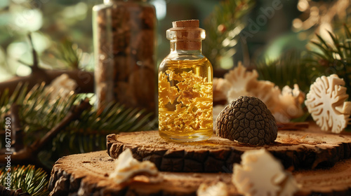 Elegant White Truffle Extract Bottle with Fresh Forest Truffles - Culinary Delicacy for Gourmet Recipes