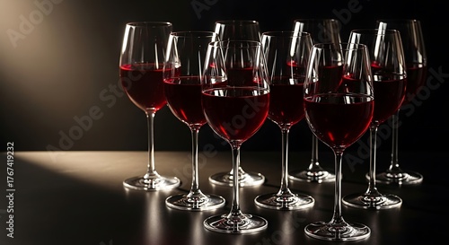 Elegant Wine Glasses Filled with Red Wine on a Dark Surface.