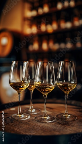 Elegant wine tasting scene captures warm cellar light on golden glasses and aged barrels