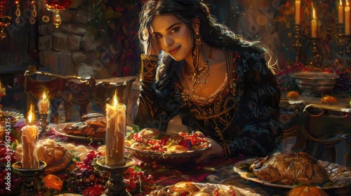 Elegant woman in medieval attire enjoying a lavish feast by candlelight, evoking a sense of historical opulence and celebration.