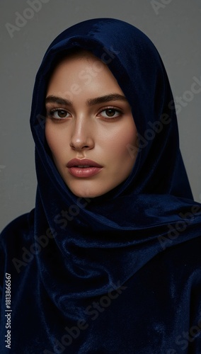 Elegant woman in navy velvet hijab with natural makeup and neutral background, modern fashion portrait highlighting modesty and confidence