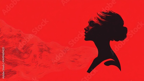 Elegant woman silhouette red background abstract artistic design modern minimalist illustration graphic art image hair style lines waves