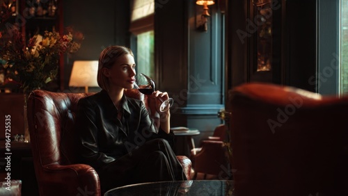 Elegant woman sips red wine in a luxurious, dimly lit lounge, exuding sophistication and calm. Perfect for themes of luxury, relaxation, high society, and fine dining.