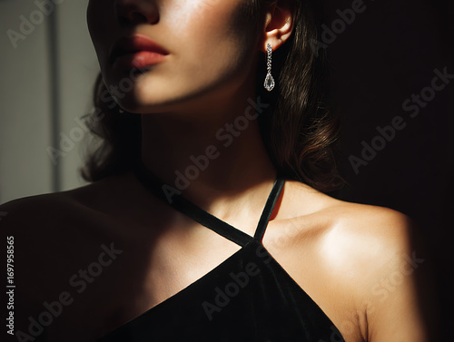 Elegant woman wearing a black halter top and dainty diamond earrings in dramatic lighting