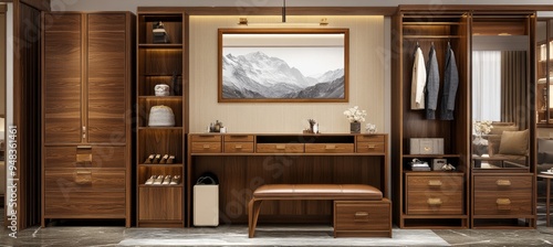 Elegant wooden wardrobe design featuring ample storage and a mountain painting in a modern entryway