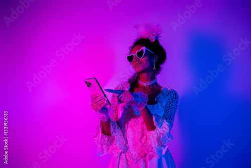 Elegant young woman in lace gown holding phone against neon pink and purple backdrop