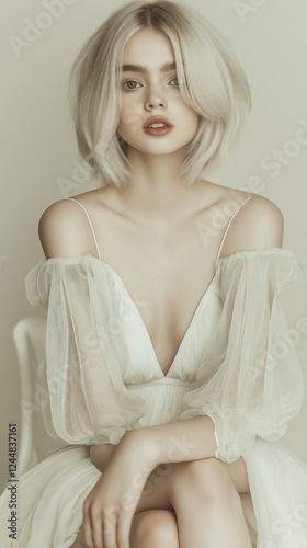Elegant young woman with a platinum blonde bob hairstyle wearing a delicate white dress, posing gracefully against a soft neutral background.
