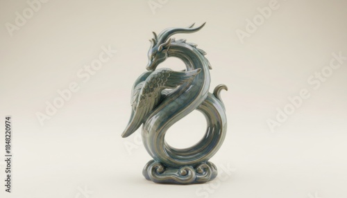 Elegantly sculpted ceramic dragon figure with iridescent scales and curved body on wave base against neutral background studio