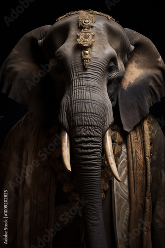 Elephant in opulent historical attire on dark background, surreal artistic portrait