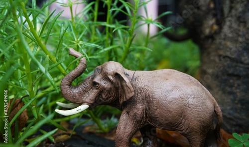 elephant toy, elephant toy on grass with green plants, looks real