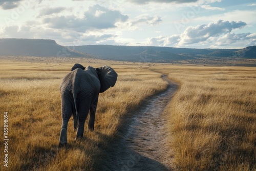 Elephant walking through tall grass in a serene landscape at sunset