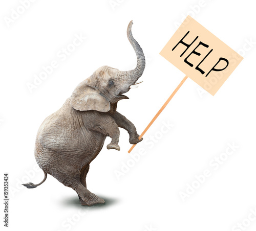 Elephant with slogan board. Animal isolated on white background. Digital collage on ecology theme. Picture with space for your text.