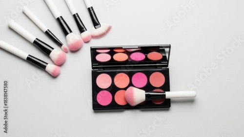 Elevated view of a blush palette and an assortment of professional makeup brushes on a clean surface