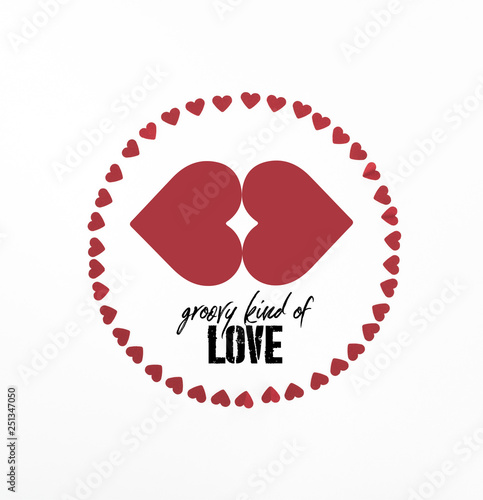 elevated view of circle made of red heart symbols isolated on white with "groovy kind of love" lettering