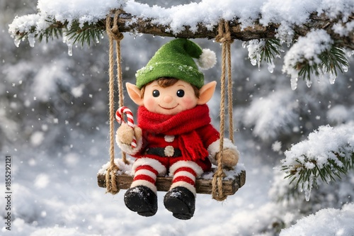 Elf Toy on Mini Swing Hanging from Snowy Branch, Red Scarf, Green Hat, Holding Mini Candy Cane, Soft Diffused Light