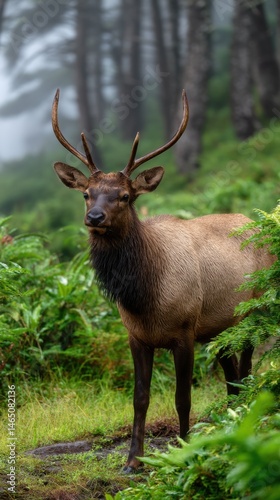 Elk in Forest, Standing amidst Lush Greenery on a Foggy Day