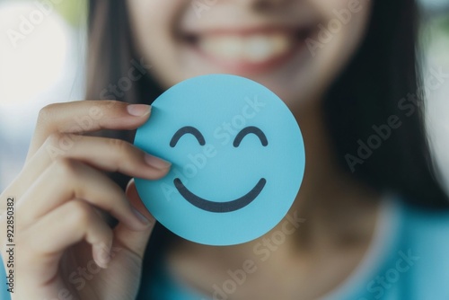 Embracing Positivity: A Woman Crafts a Joyful Smile on Blue Paper for World Mental Health Day, Symbolizing the Importance of Active Thinking and Psychological Well-being.