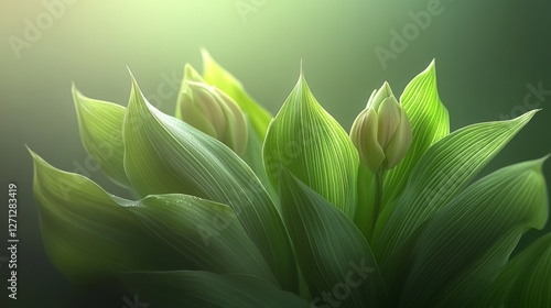 Emerald Elegance Macro Photography of Lush Green Leaves Unfurling Under Soft Sunlight