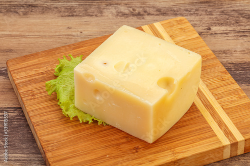 Emmental cheese over wooden board