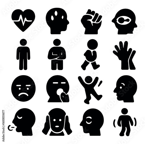 Emotion silhouette icon set: heartbeat, profile, gestures, walk, face, expression, hands, movement