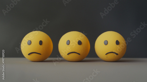emotional, mood, sadness concept: three yellow balls with sad faces arranged in a slightly slumped pattern against an isolated ash gray background